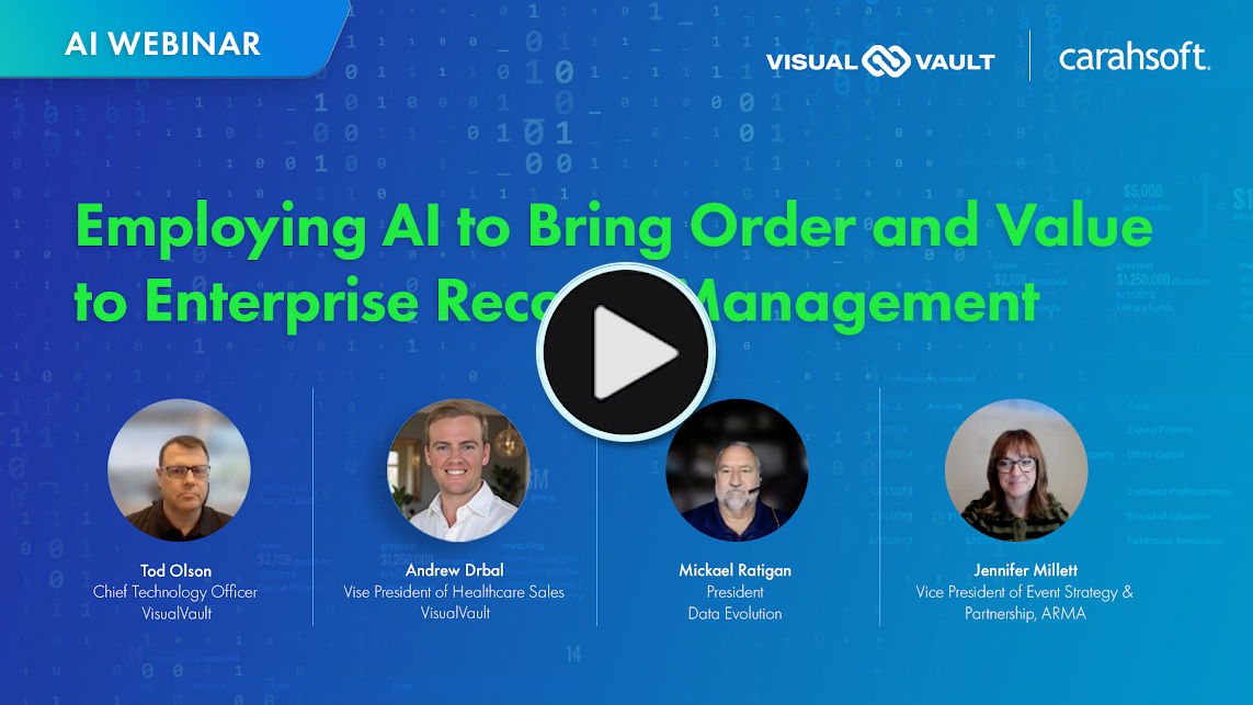 VisualVault have been experts in bringing efficiency to the management of data and documents for decades. So, employing Artificial Intelligence (AI) to bring greater efficiencies to the process is a natural for VisualVault. While the possibilities for the application of AI technology are unlimited, there are four applications that are presently creating the greatest real world and immediate value for our clients: